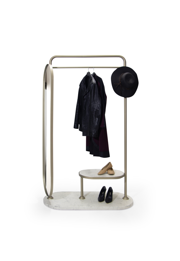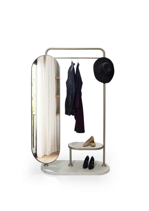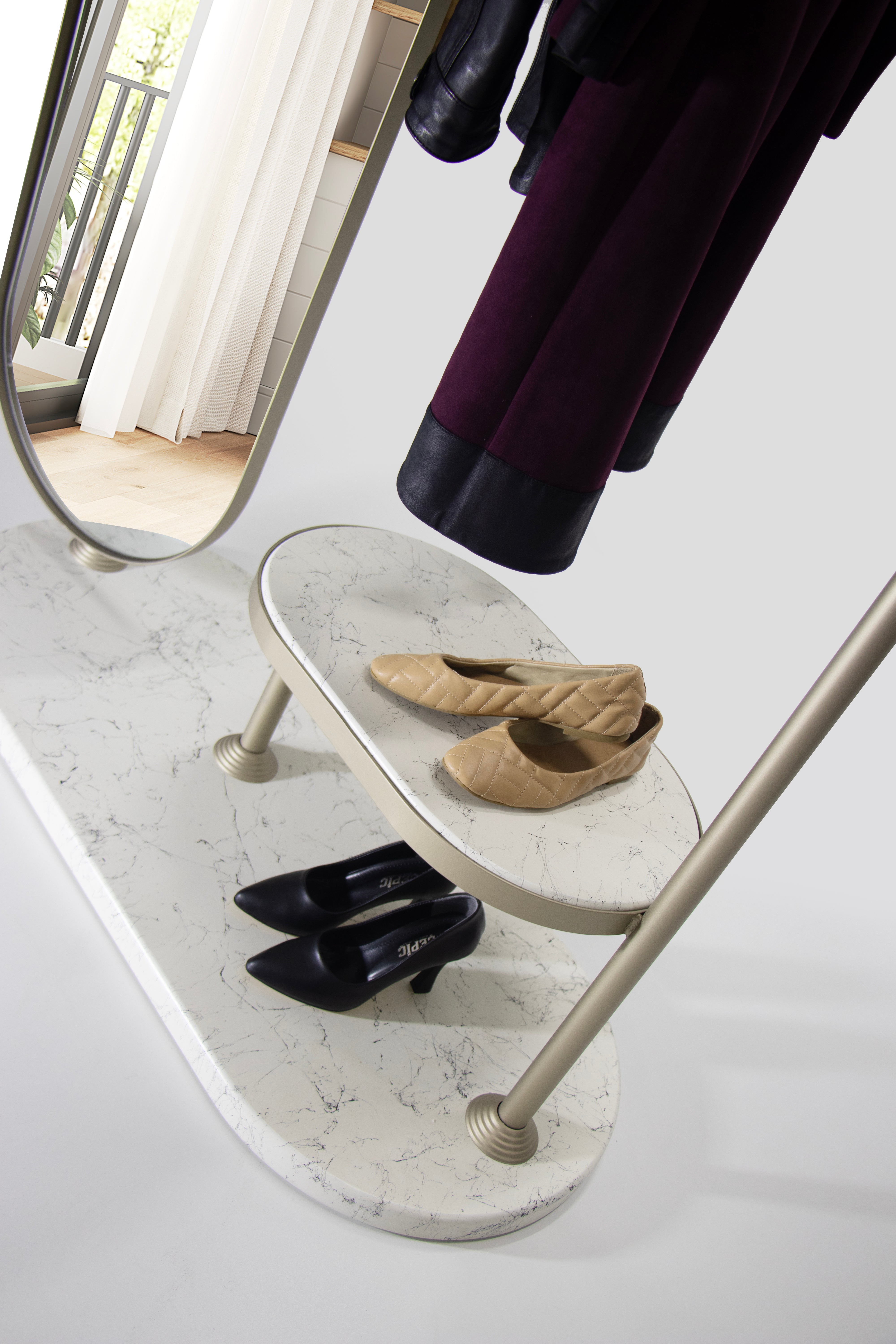 Structura sa în finisaj alb și auriu adaugă un plus de rafinament, transformând orice spațiu într-un loc ordonat și elegant. Oglinda verticală este ideală pentru verificarea ținutei înainte de a ieși, iar măsuța integrată oferă loc pentru pantofi, genți sau obiecte decorative.