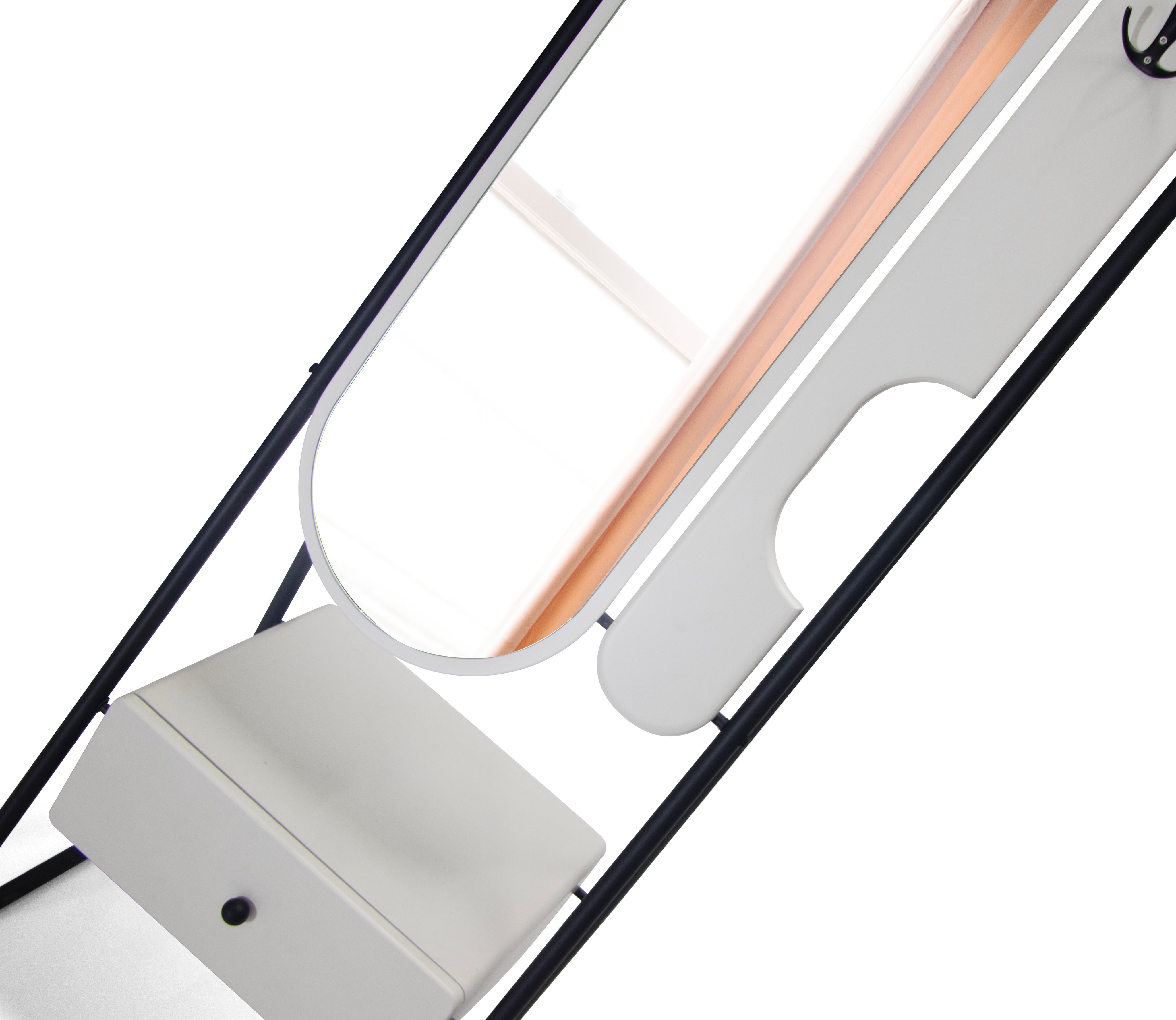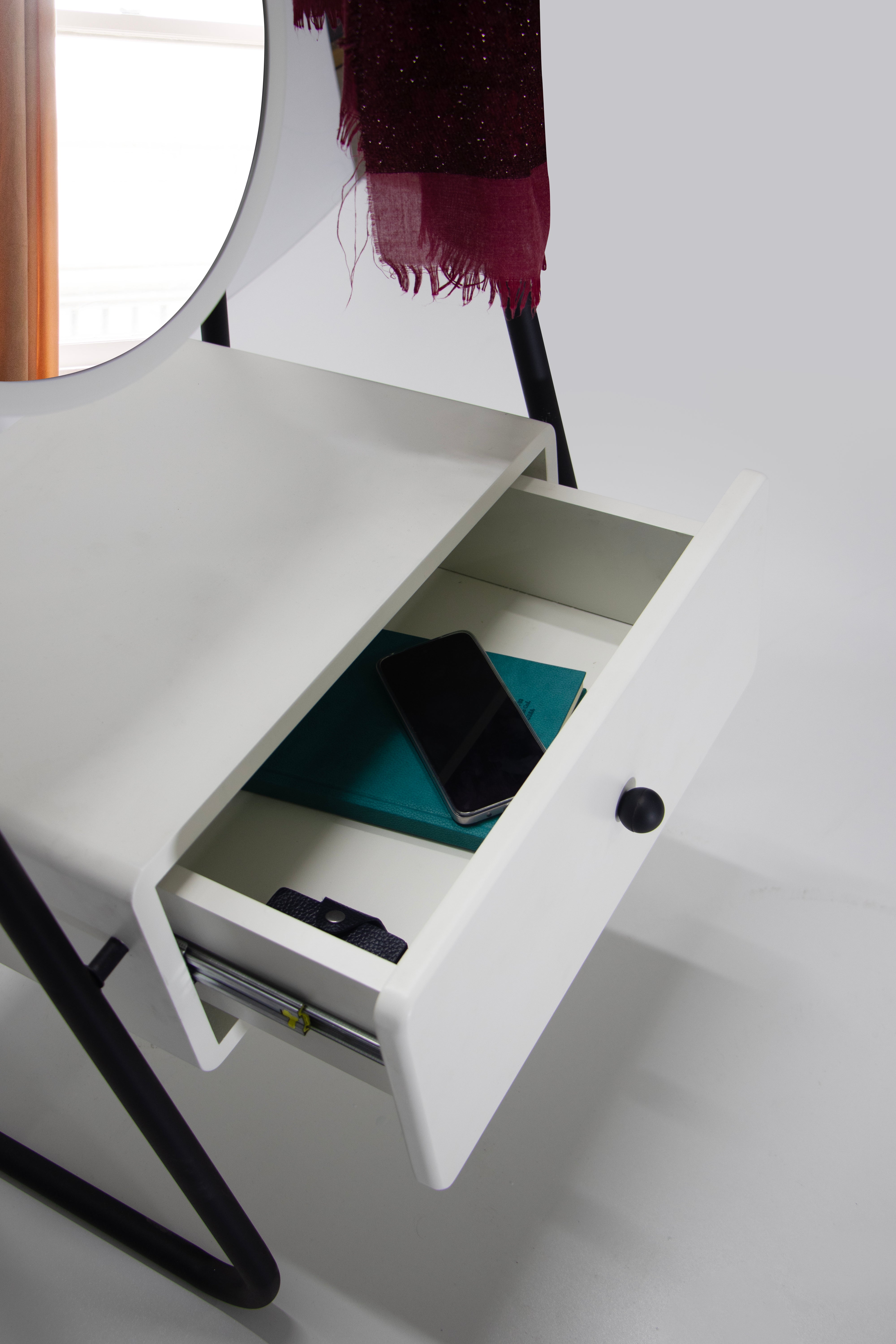 Designul minimalist în nuanțe de alb și negru adaugă un aer sofisticat, potrivindu-se perfect atât în interioare contemporane, cât și clasice. Sertarul este ideal pentru depozitarea discretă a pantofilor, accesoriilor sau altor obiecte personale, iar oglinda vă ajută să vă completați ținuta înainte de a ieși din casă.