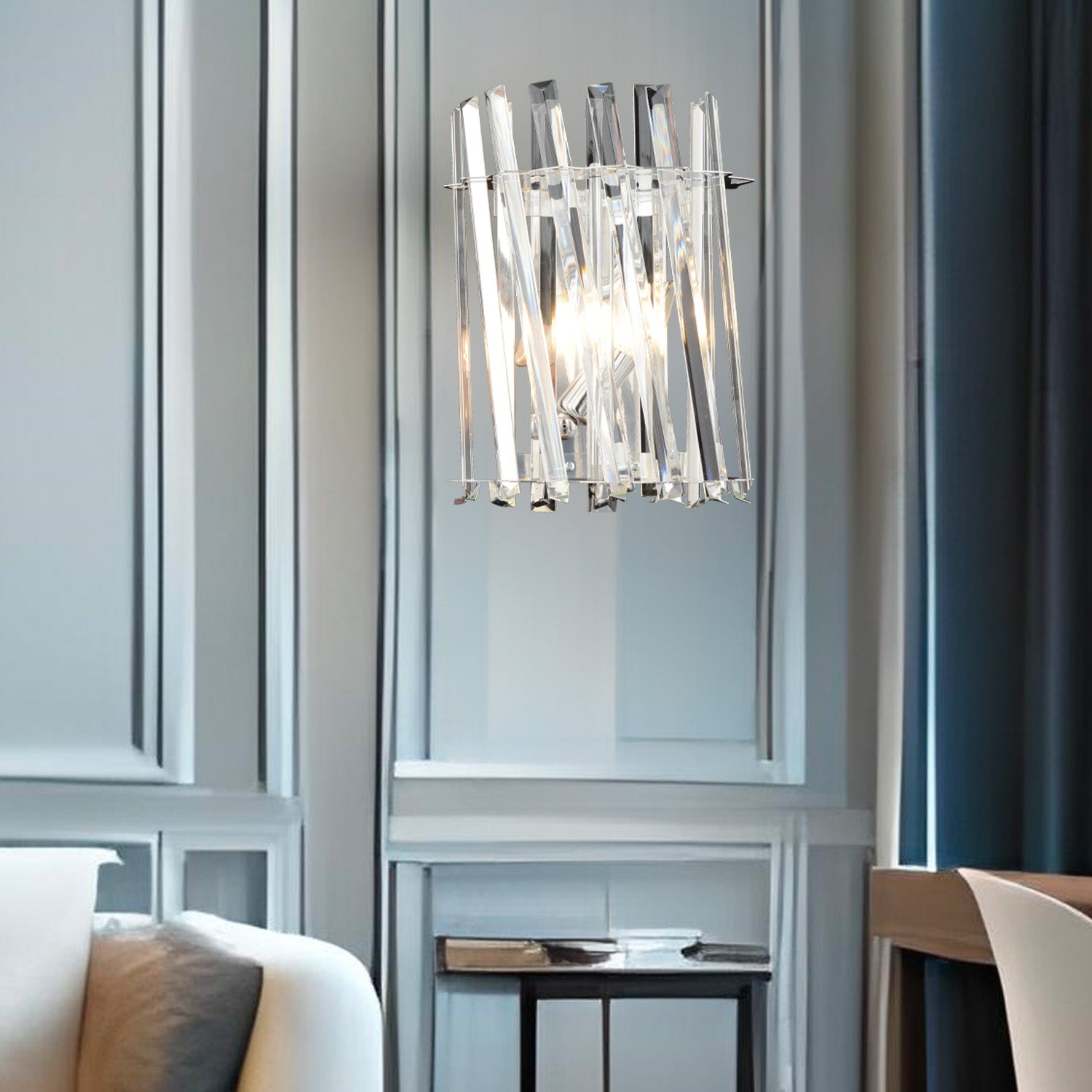 Această aplică de perete SAUCER cromată, cu detalii elegante din cristal, oferă o lumină ambientală ideală pentru spații rafinate. Designul său fix și cristalele transparente din sticlă adaugă un plus de eleganță în camerele moderne.