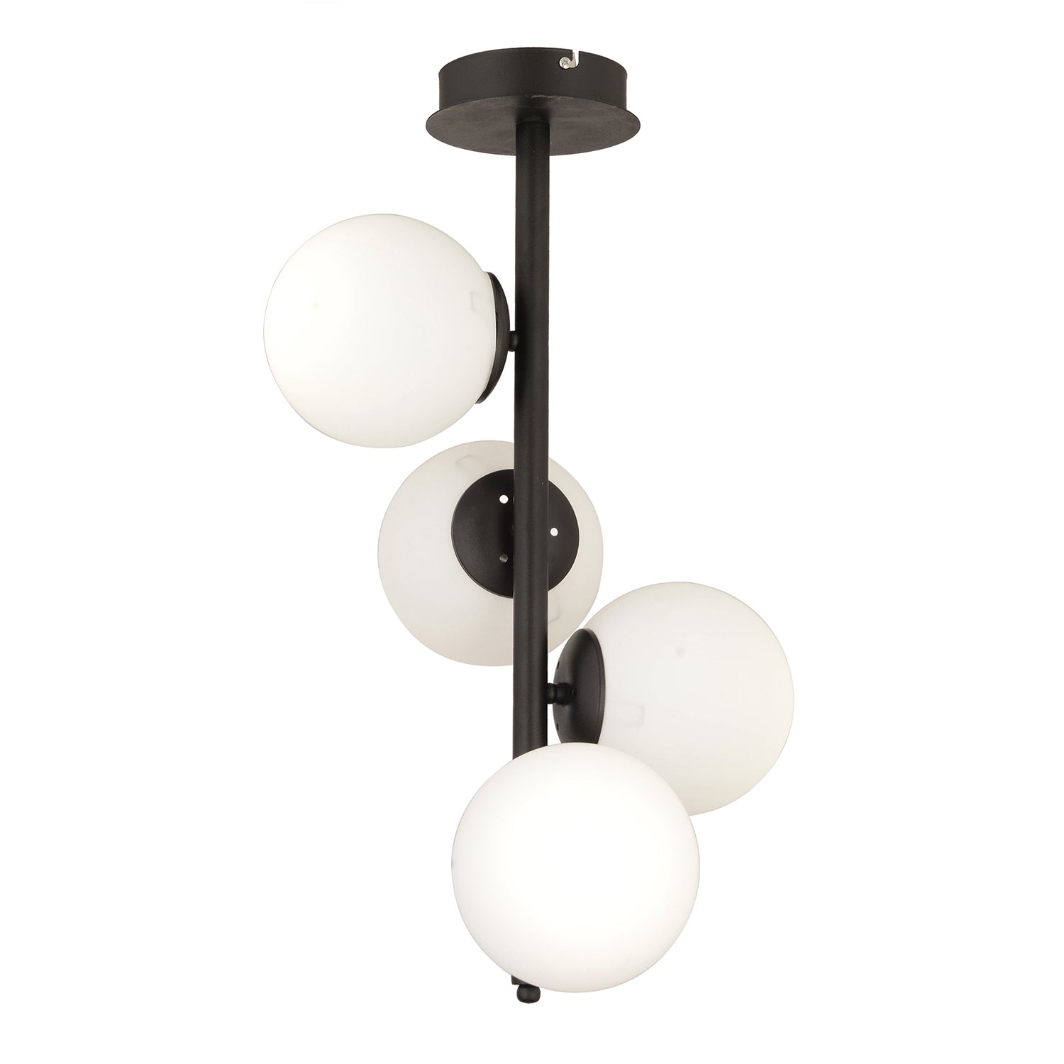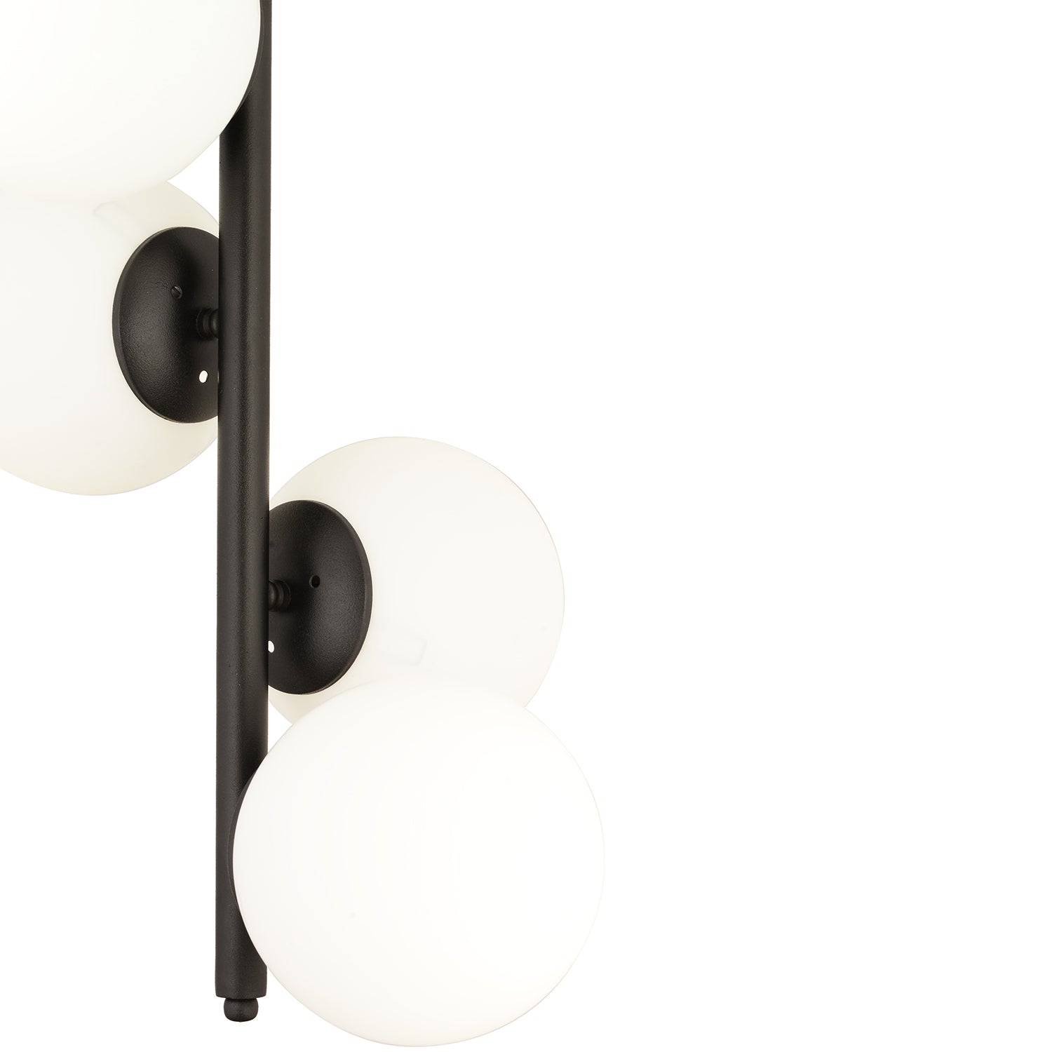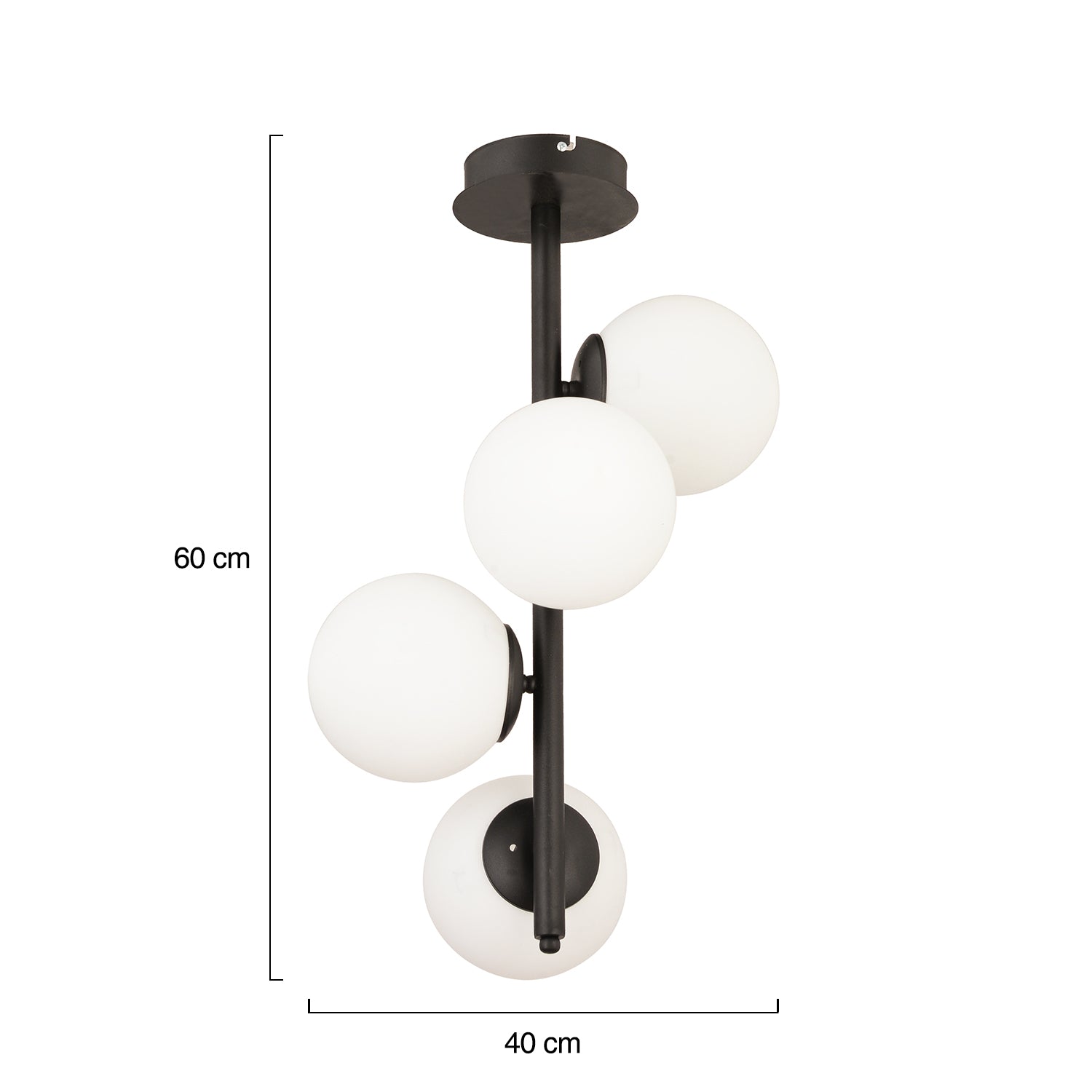 Candelabrul UZEL cu 4 becuri și finisaj negru mat este ideal pentru interioare elegante și rafinate. Sticla albă oferă o lumină difuză și caldă, perfectă pentru sufragerii, holuri sau dormitoare amenajate clasic.