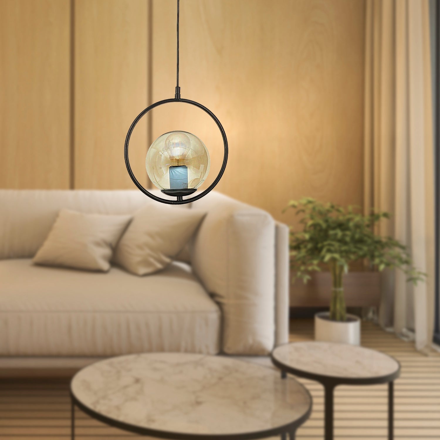 LUİS este o lampă suspendată elegantă cu finisaj negru mat și abajur din sticlă colorată în nuanță de chihlimbar. Potrivită pentru spații moderne și clasice, oferă un accent decorativ plăcut și o lumină caldă pentru camere de zi, dormitoare sau holuri.