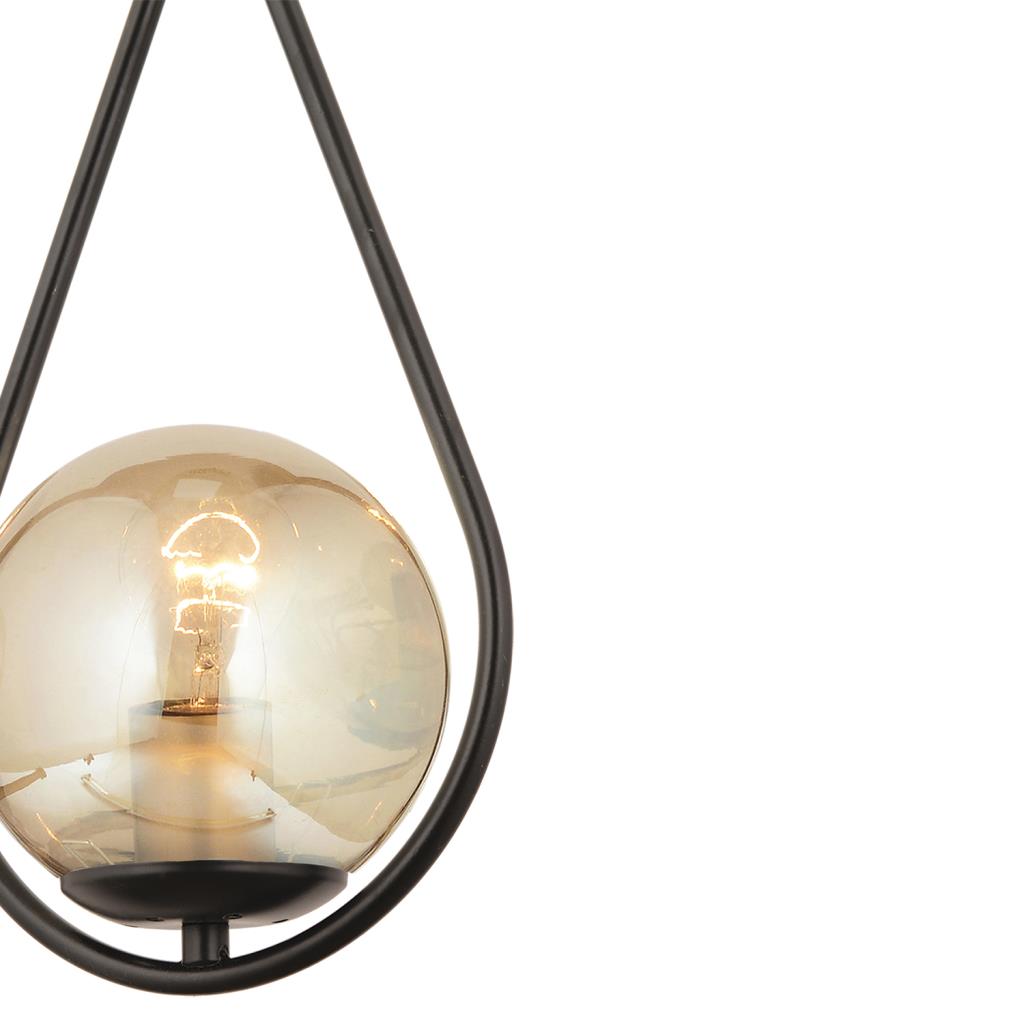 MİRZA este o lampă suspendată cu un design rafinat, combinând finisajul metalic negru cu un abajur elegant de sticlă în nuanță de chihlimbar. Se potrivește perfect în spații moderne sau clasice, oferind o lumină caldă și o atmosferă plăcută în orice încăpere.