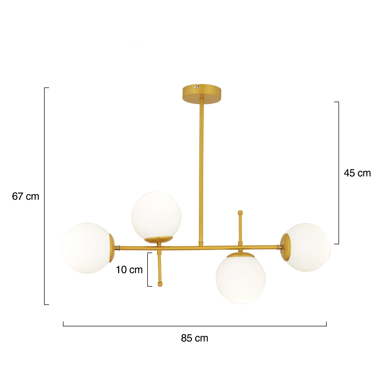 Lustra GÜNAY cu 4 becuri și finisaj auriu adaugă rafinament și strălucire oricărui spațiu interior. Sticla albă de 15 cm oferă o lumină plăcută și uniformă, ideală pentru sufragerii, dormitoare sau zone de relaxare.