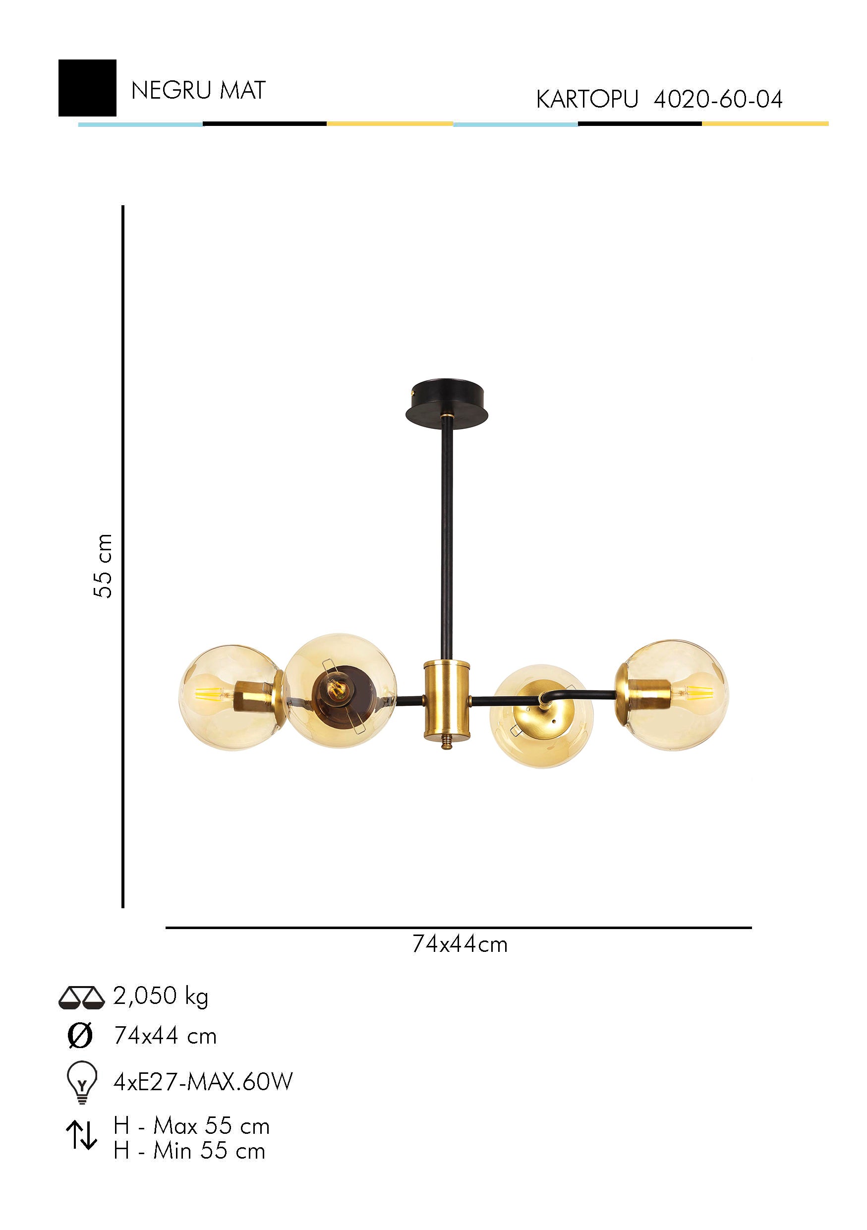 Lustra HubRom, KARTOPU 4020-60-04 55x74x44xHmax55  cm 4xE27-60W Negru / Antiq