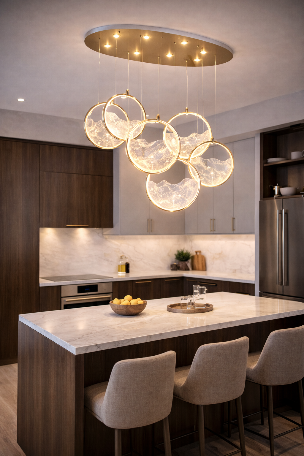 Cu un design modern și proporții echilibrate, lustra LED suspendată GEYIK Auriu 5407-2153-83 este alegerea ideală pentru spații contemporane precum bucătării moderne și zone de dining. Forma alungită a bazei de tavan și elementele circulare suspendate creează un efect vizual elegant și bine structurat, perfect pentru amplasarea deasupra insulei de bucătărie sau a mesei.