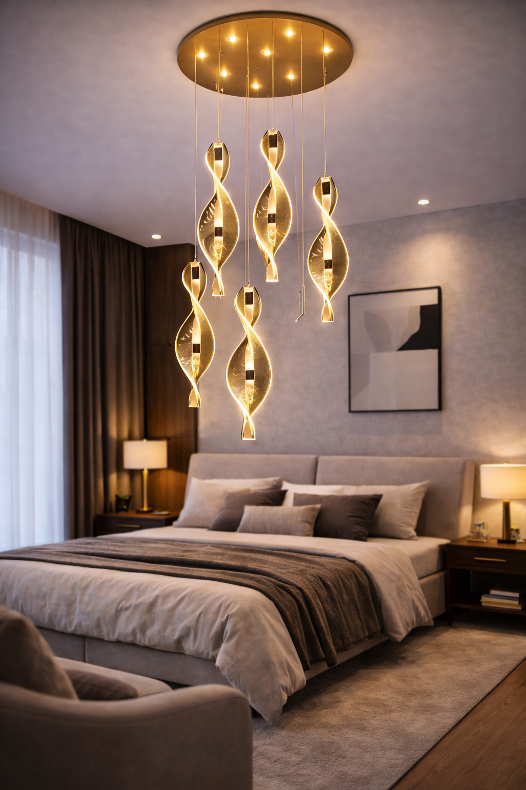 Structura sa suspendată, cu elemente dispuse la diferite înălțimi, oferă profunzime și rafinament spațiului. Datorită posibilității de a selecta lumina caldă, neutră sau rece, lustra se adaptează perfect diferitelor momente ale zilei și preferințelor de iluminare. Este ideală pentru dormitoare moderne, livinguri elegante, holuri înalte sau spații de accent premium.