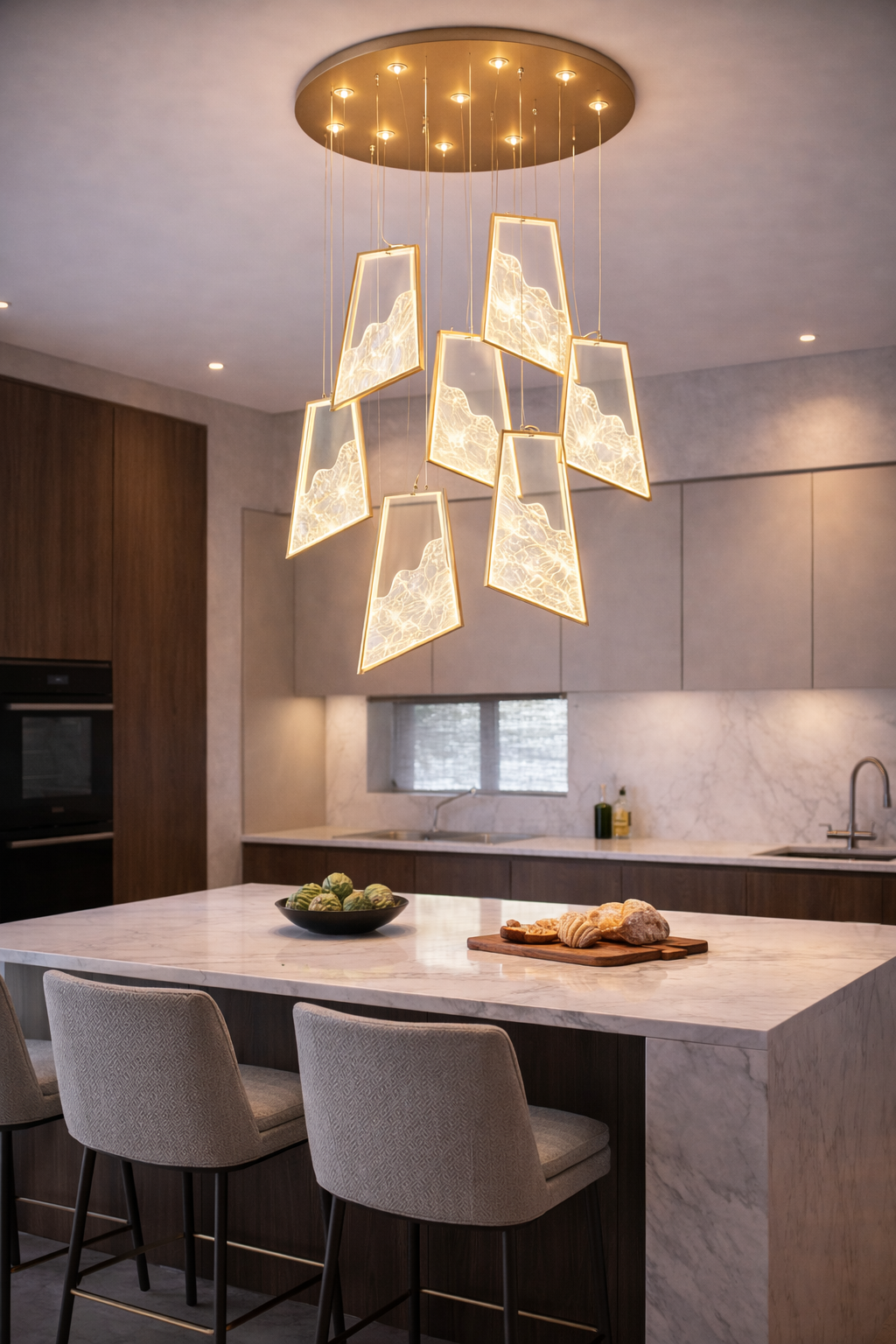 Ramele metalice cu finisaj auriu, împreună cu panourile luminoase cu efect marmorat, oferă o iluminare uniformă și plăcută. Lumina neutră de 3200K asigură un echilibru optim între funcționalitate și confort vizual, fiind potrivită pentru activitățile zilnice din bucătărie, dar și pentru momentele de socializare.