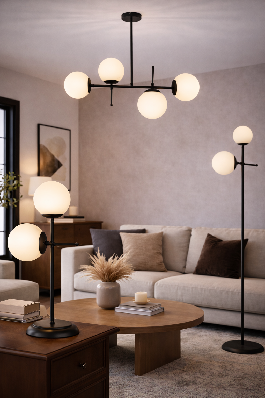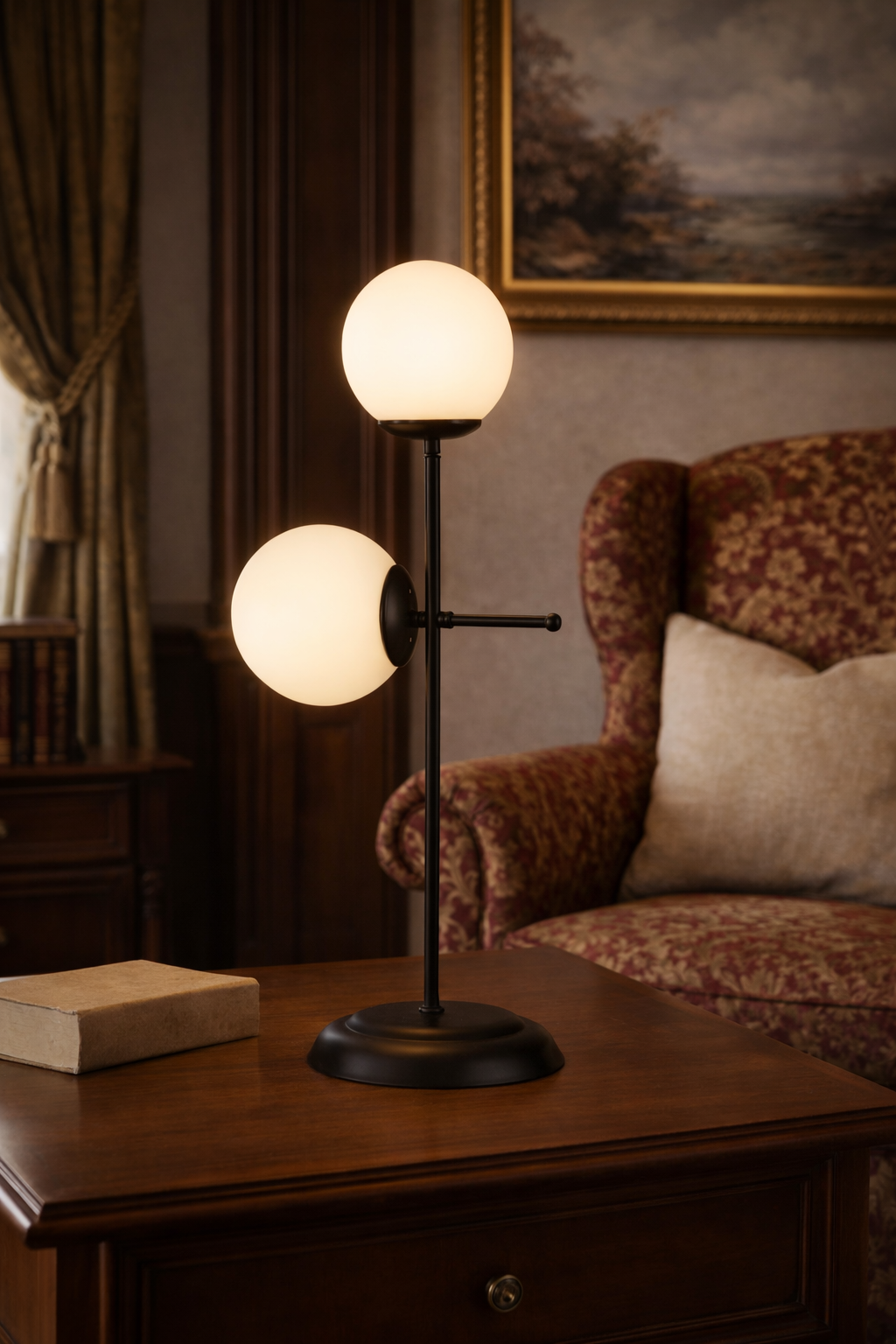 Cele două globuri din sticlă opală asigură o lumină difuză și confortabilă, perfectă pentru crearea unei atmosfere relaxante. Structura metalică solidă garantează stabilitate și durabilitate, iar forma echilibrată transformă această veioză într-un element decorativ de impact, chiar și atunci când nu este aprinsă.